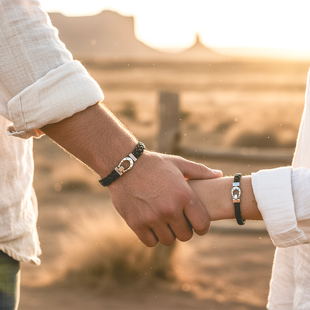 Chaque bracelet est confectionné en acier et crin de cheval tressé, alliant robustesse, authenticité et savoir-faire artisanal.